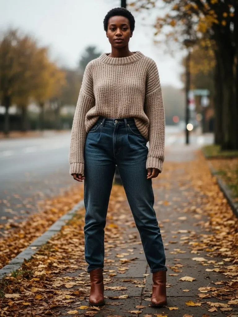 This outfit features a chunky neutral knit sweater styled with dark wash straight leg jeans and brown ankle boots. The simple color palette keeps the look timeless and easy to style.