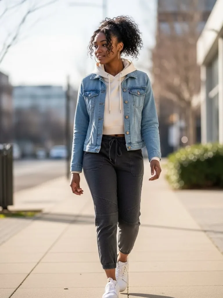 This look combines a light wash denim jacket with a cozy neutral hoodie and relaxed dark jogger pants. White sneakers and a casual fit give it an easy street style vibe that feels fresh and modern.