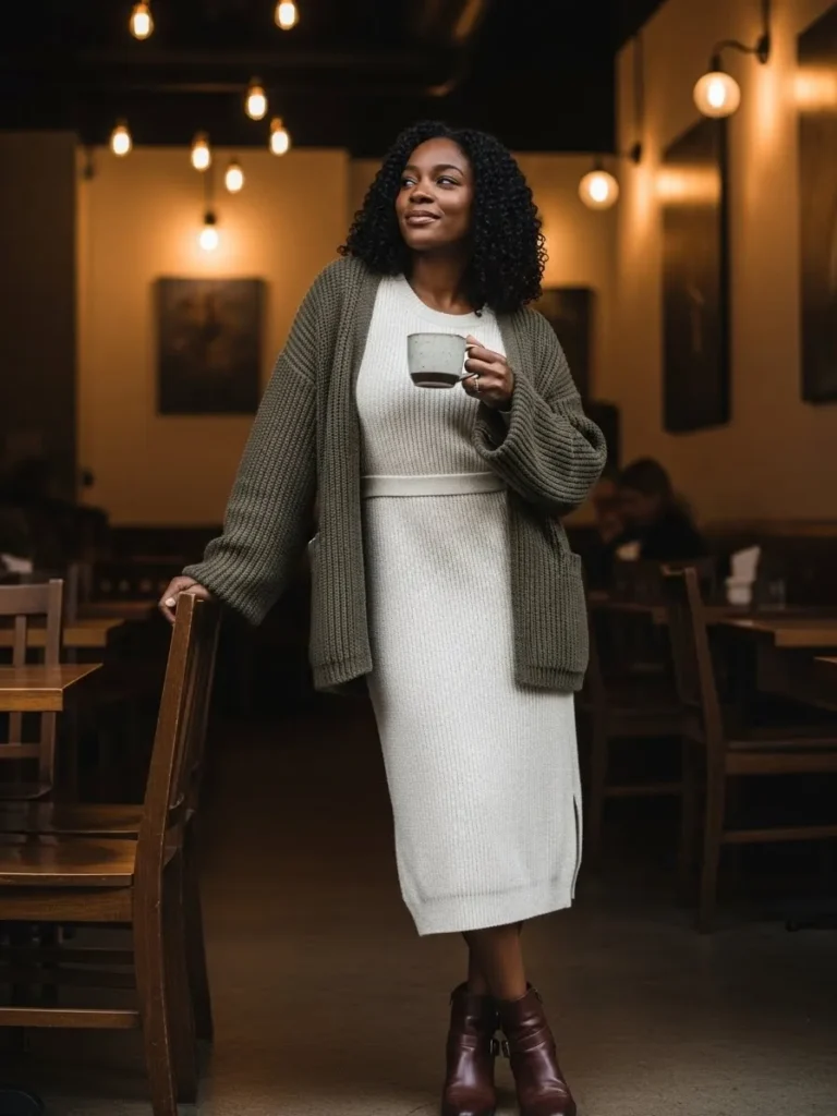 This outfit features a ribbed knit midi dress in a soft neutral shade paired with a chunky oversized cardigan. Ankle boots and warm café lighting bring out the cozy fall mood perfectly.
