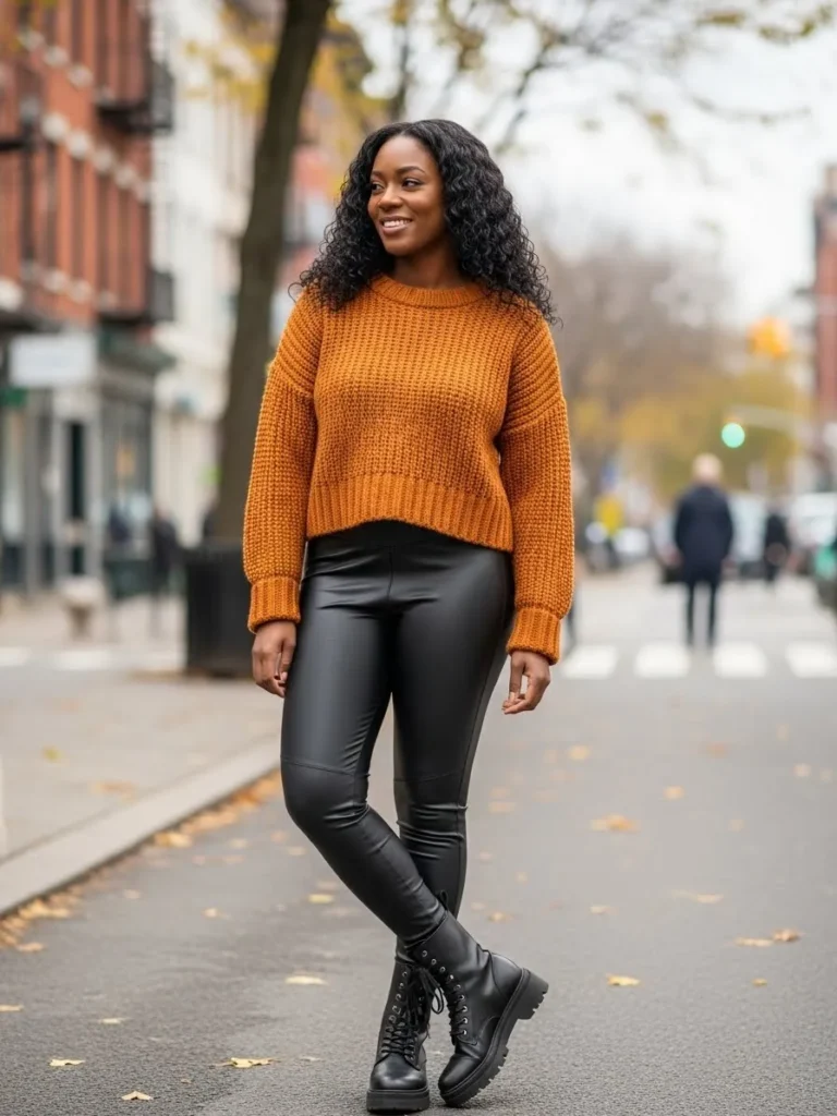 This look pairs a warm rust toned knit sweater with sleek black faux leather pants and chunky lace up boots. The mix of soft texture and structured shine creates a bold but wearable fall outfit.