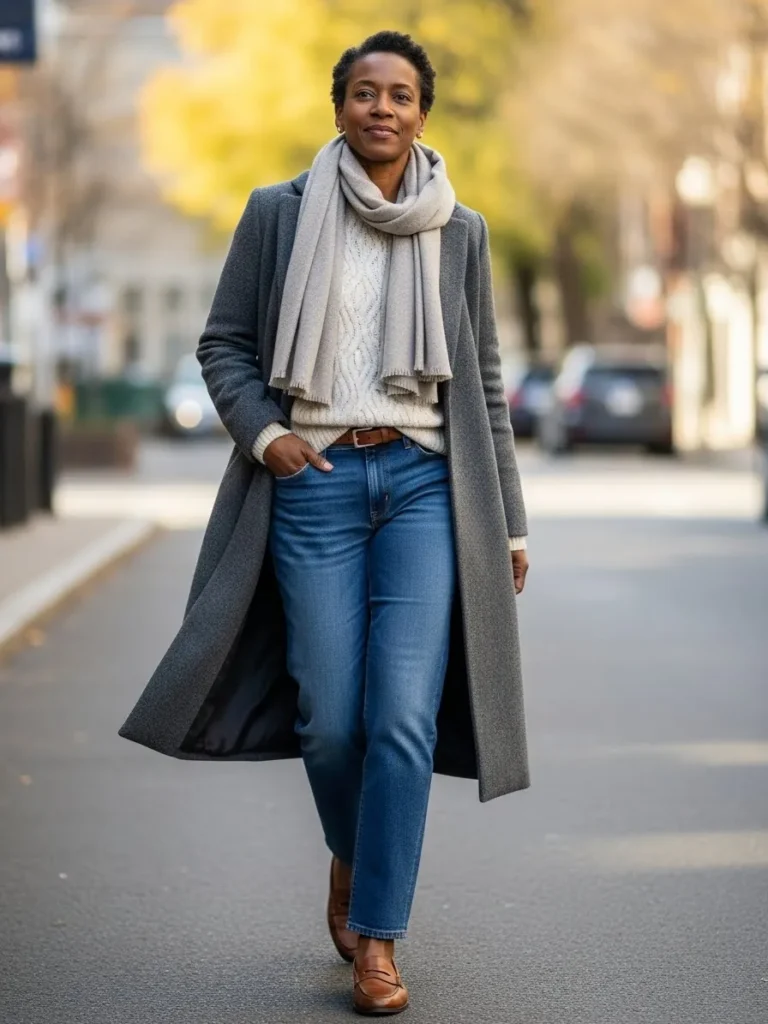 This outfit features a long gray wool coat layered over a cable knit sweater, blue jeans, and a soft neutral scarf. Brown loafers keep it classic and comfortable while adding warmth.