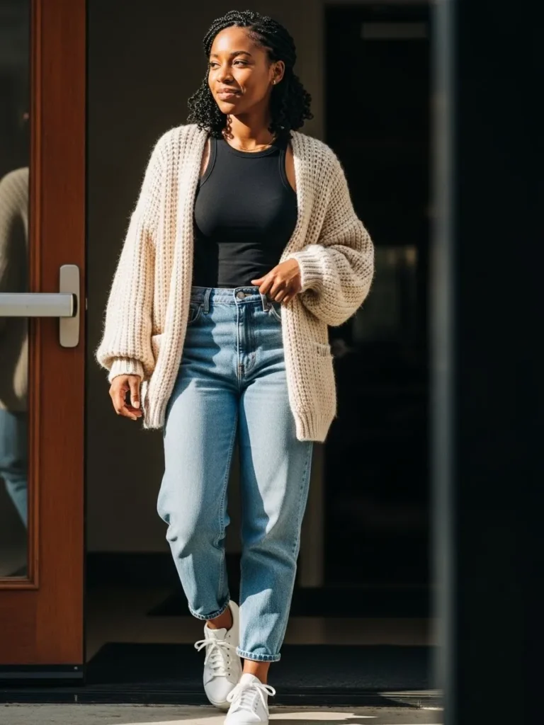 This outfit pairs a chunky beige knit cardigan with a fitted black tank top and light wash straight leg jeans. White sneakers keep the look clean and casual, while the soft textures make it feel cozy and relaxed for fall days.