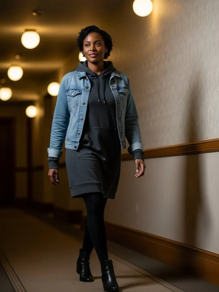 This outfit combines a charcoal hoodie dress with a classic denim jacket and black tights. Black ankle boots add structure while keeping the overall vibe relaxed and practical.