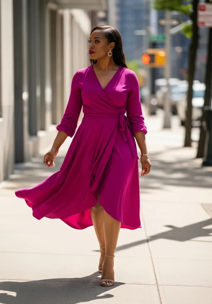 I love wrap dresses in bold pink because they flatter so easily. The movement makes it feel special without trying too hard. It is pure Barbie energy.