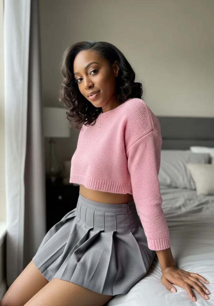 This outfit features a cropped pink sweater paired with a light pleated mini skirt. The knit top feels cozy while the skirt adds structure and movement. The pink palette keeps everything playful and youthful.
