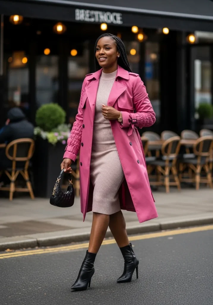 I love layered pink outfits because they feel luxurious and intentional. The coat adds drama while the dress keeps it feminine. It always makes a statement.