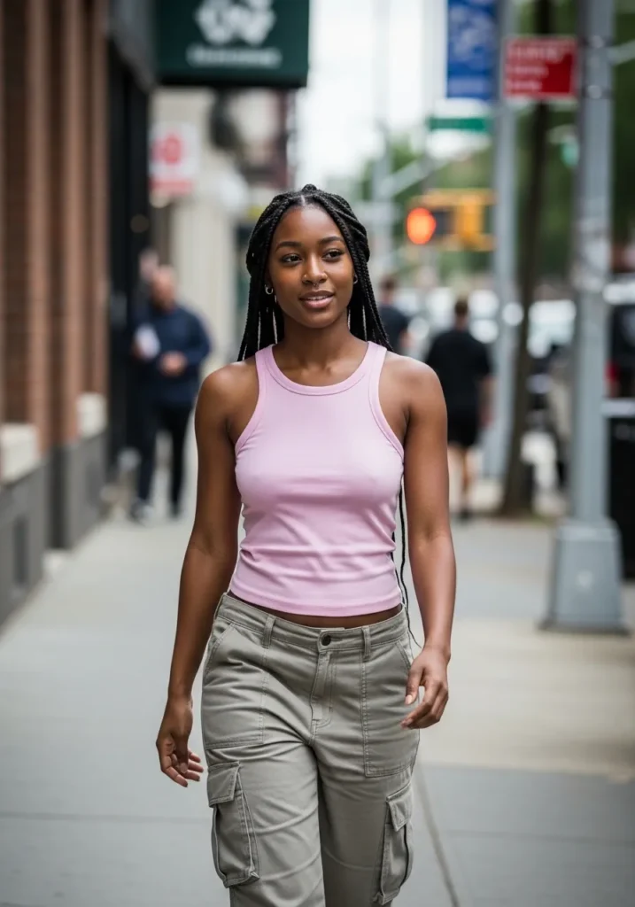This outfit features a fitted pink tank top styled with light utility pants. The tank keeps the look sleek while the pants add a casual modern edge. The pink brings in that Barbie softness.
