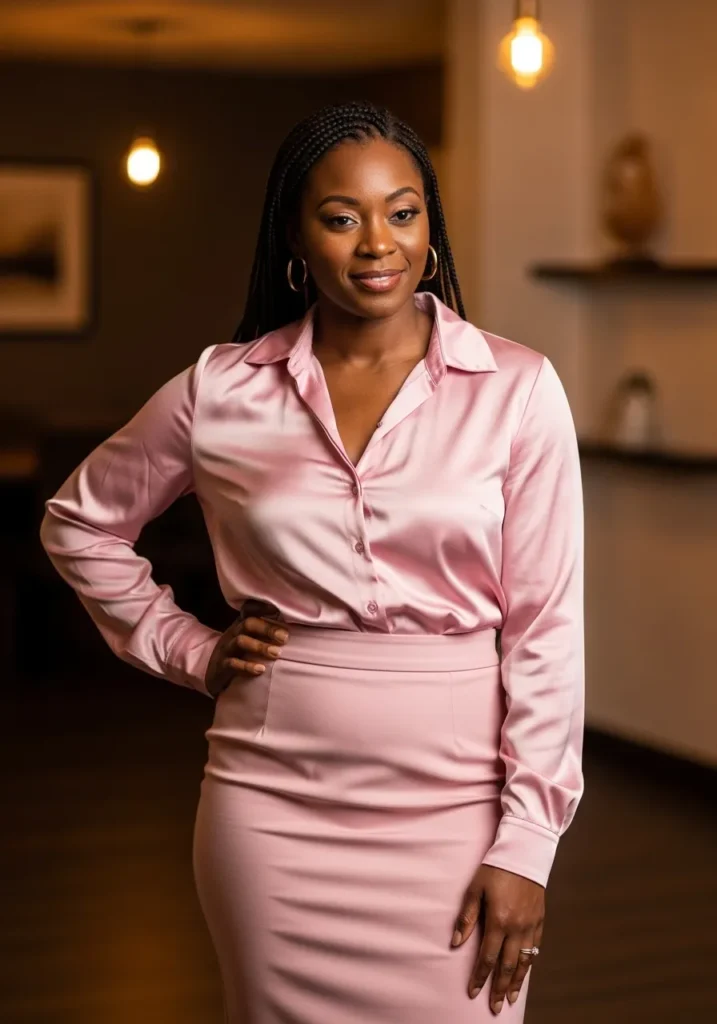 This outfit features a silky pink button down blouse tucked into a matching pink pencil skirt. The satin fabric gives it a glossy Barbie finish while the fitted silhouette feels polished and feminine. The monochrome pink makes the look feel luxe and intentional.