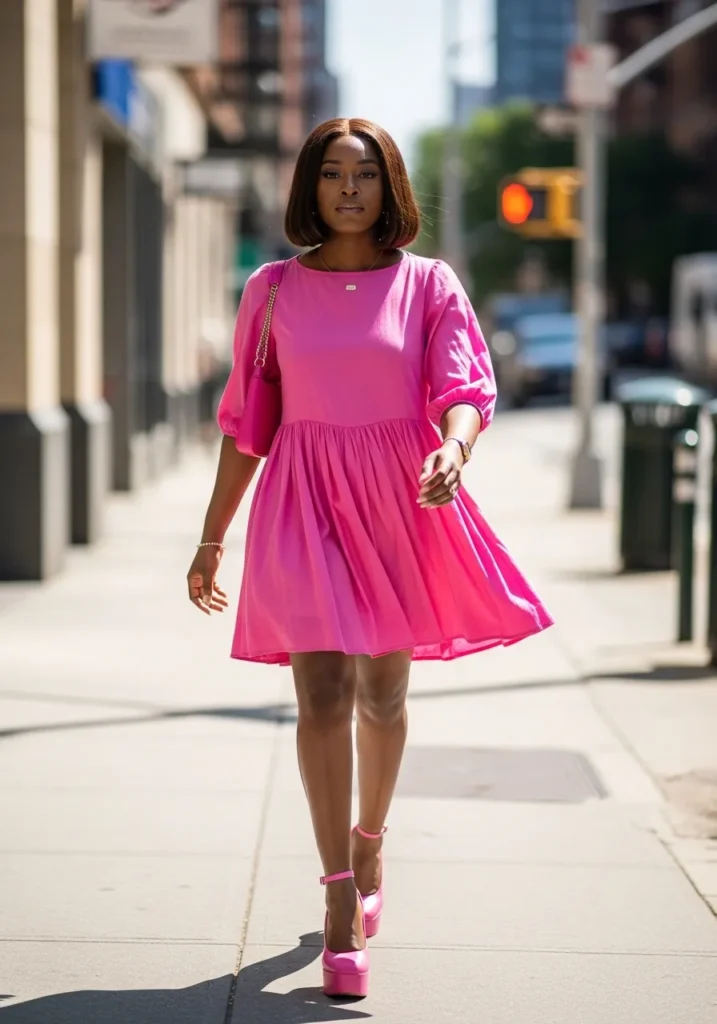 This look showcases a bright pink skater dress with a fitted top and flared skirt. The fabric looks light and bouncy which adds movement as you walk. The overall vibe feels playful youthful and very Barbie coded.