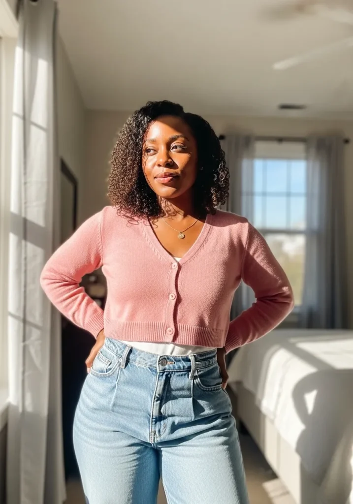 This outfit features a soft pink cardigan styled with high waisted blue jeans. The knit looks cozy and feminine while the denim keeps the look grounded. The color palette feels fresh and effortless.