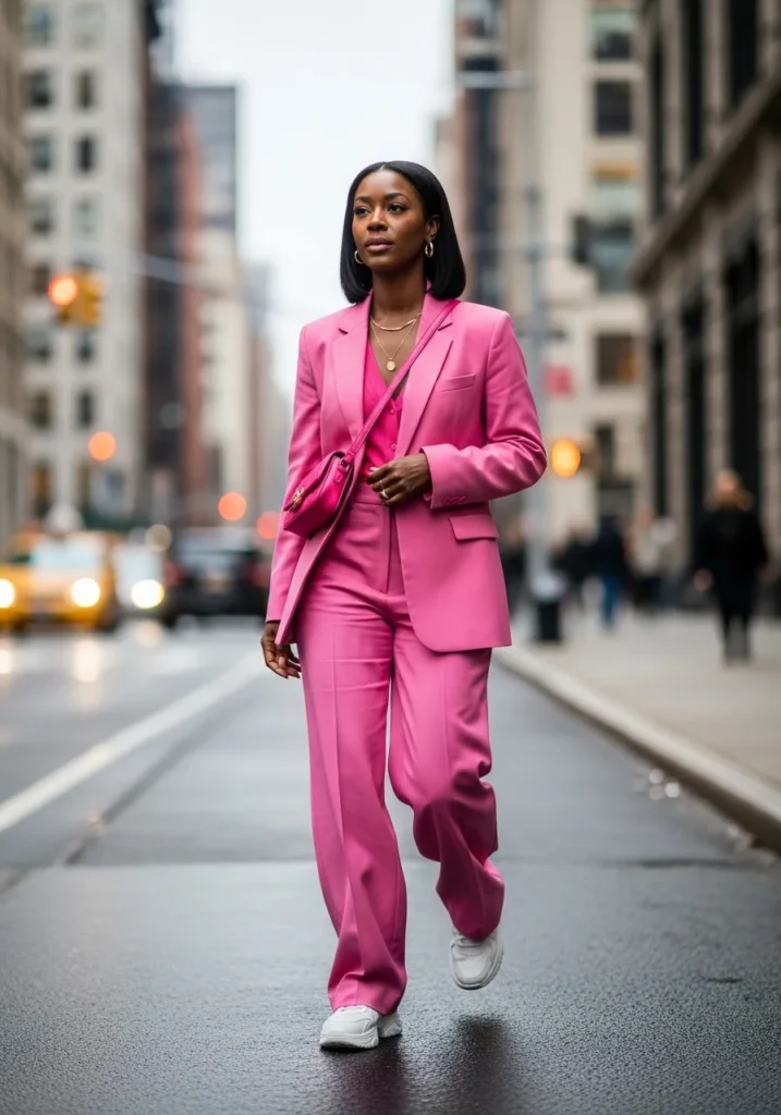 This look is a bold hot pink tailored suit with a blazer and matching trousers styled with sneakers. The structure feels sharp while the color keeps it playful and fashion forward. It gives full Barbie boss energy.