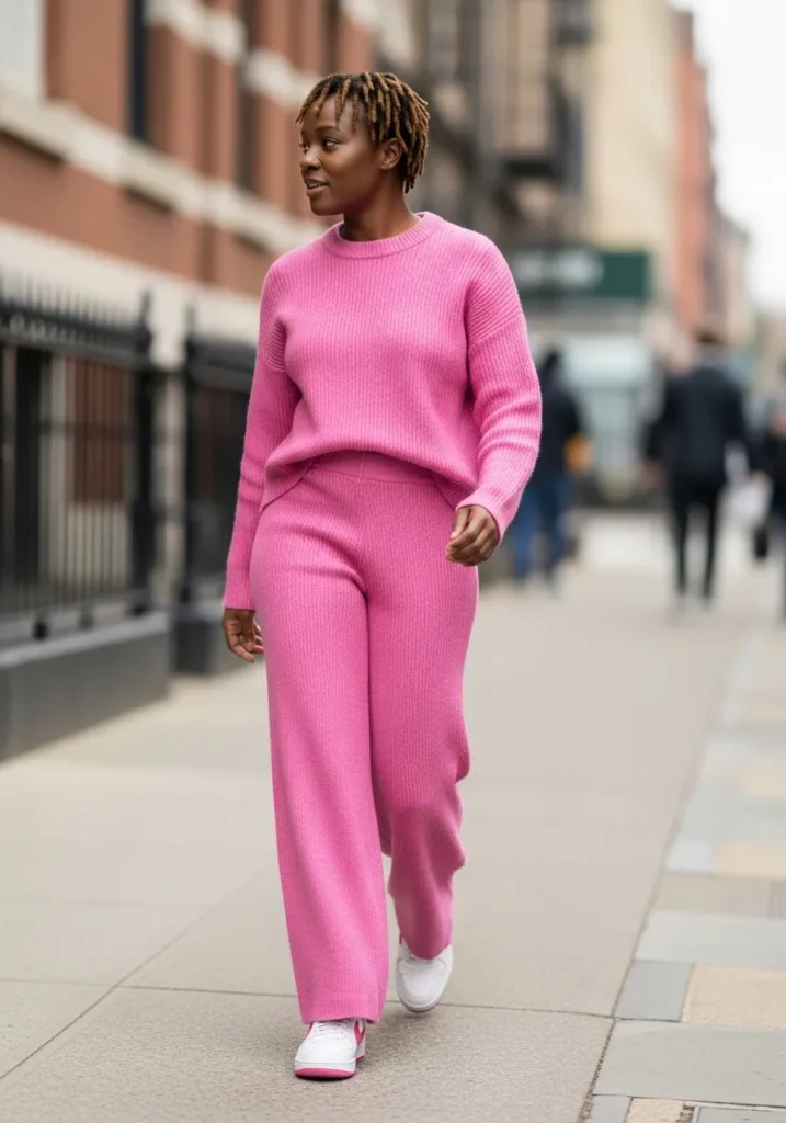 I love pink lounge sets because they feel effortless yet put together. The full pink look makes it feel intentional. It is comfort with style.