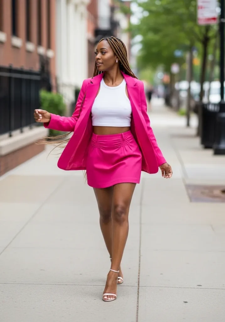 This look pairs a hot pink mini skirt with a matching blazer and white top. The skirt keeps it playful while the blazer adds polish. The color makes the whole outfit pop.