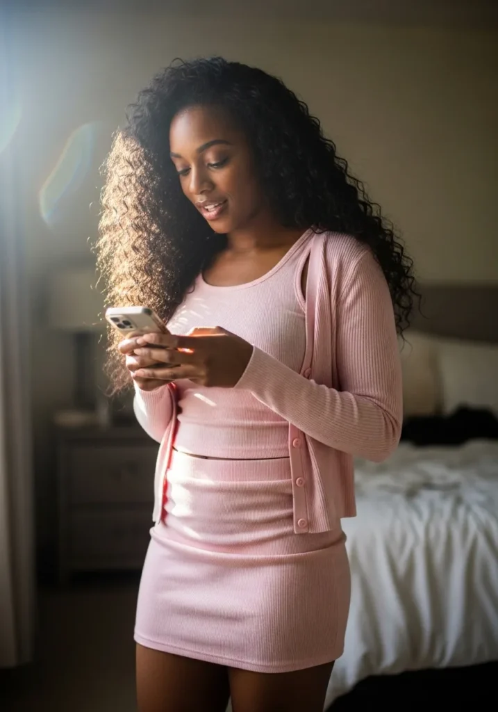 This outfit features a soft pink fitted mini dress layered with a matching cardigan. The fabric looks smooth and stretchy with a flattering close fit. The overall vibe feels cozy feminine and very Barbie coded.