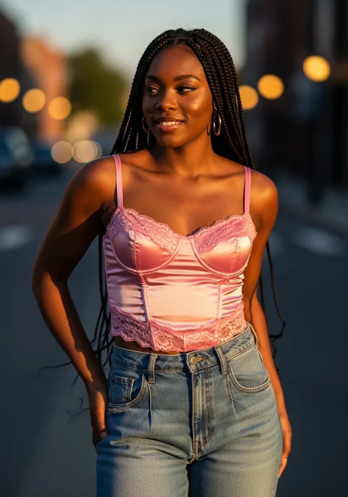 This outfit features a structured pink corset style top paired with classic blue jeans. The top adds shape and shine while the denim keeps it casual and modern. The vibe feels playful but balanced.