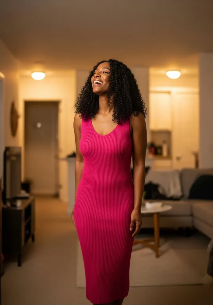 This look pairs a hot pink bodycon midi dress with a black leather jacket. The fitted dress keeps it sleek while the jacket adds contrast and attitude. The mix feels bold and confident.