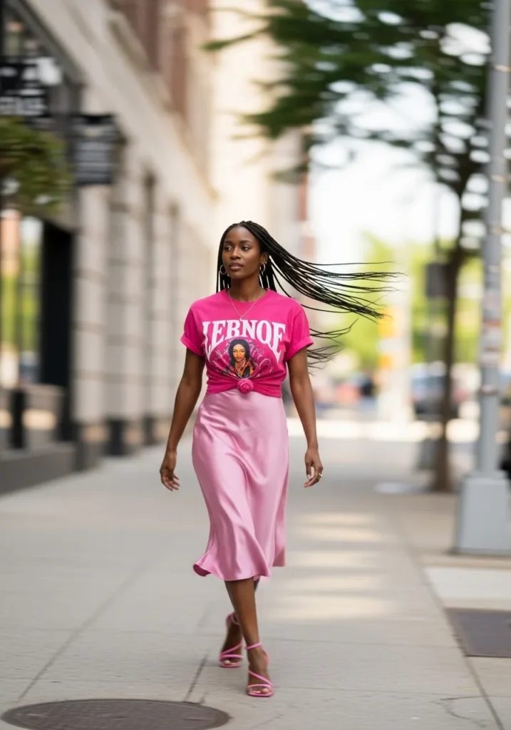 This look pairs a playful Barbie graphic tee with a soft pink midi skirt and heels. The skirt adds movement while the tee keeps it fun and youthful. The mix feels relaxed but styled.