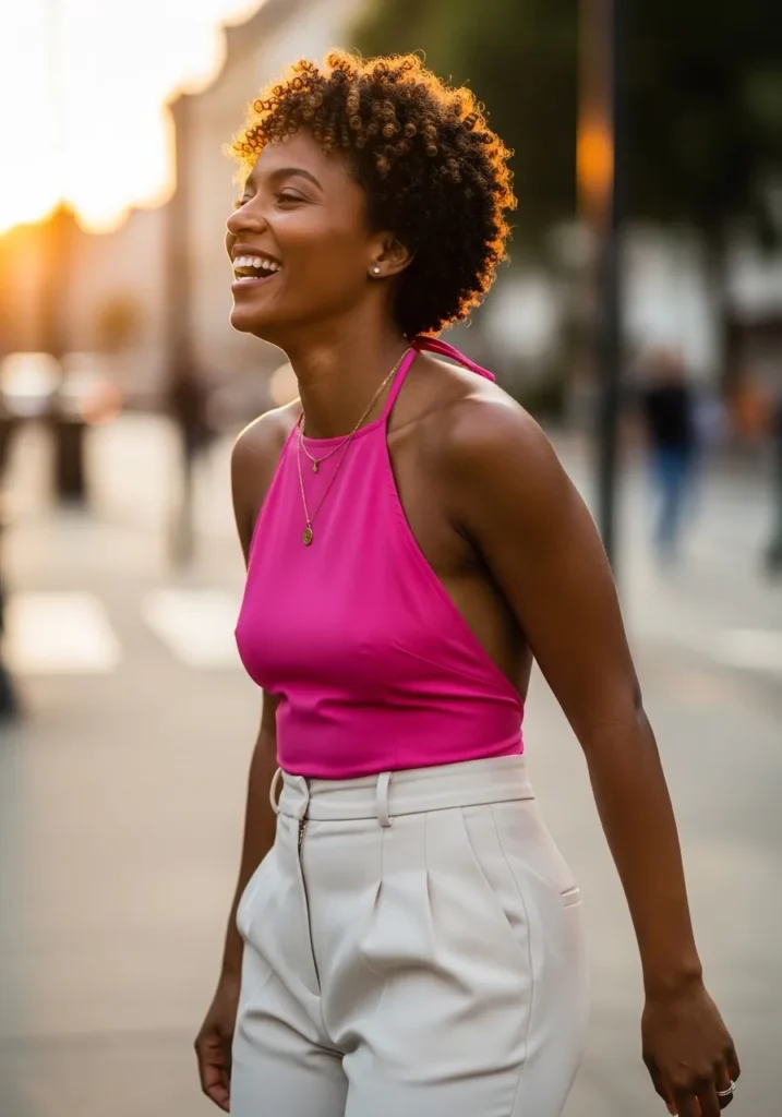 I love halter tops in bold pink because they feel flirty but still polished. This look feels effortless and modern. It is perfect for standing out without feeling overdressed.