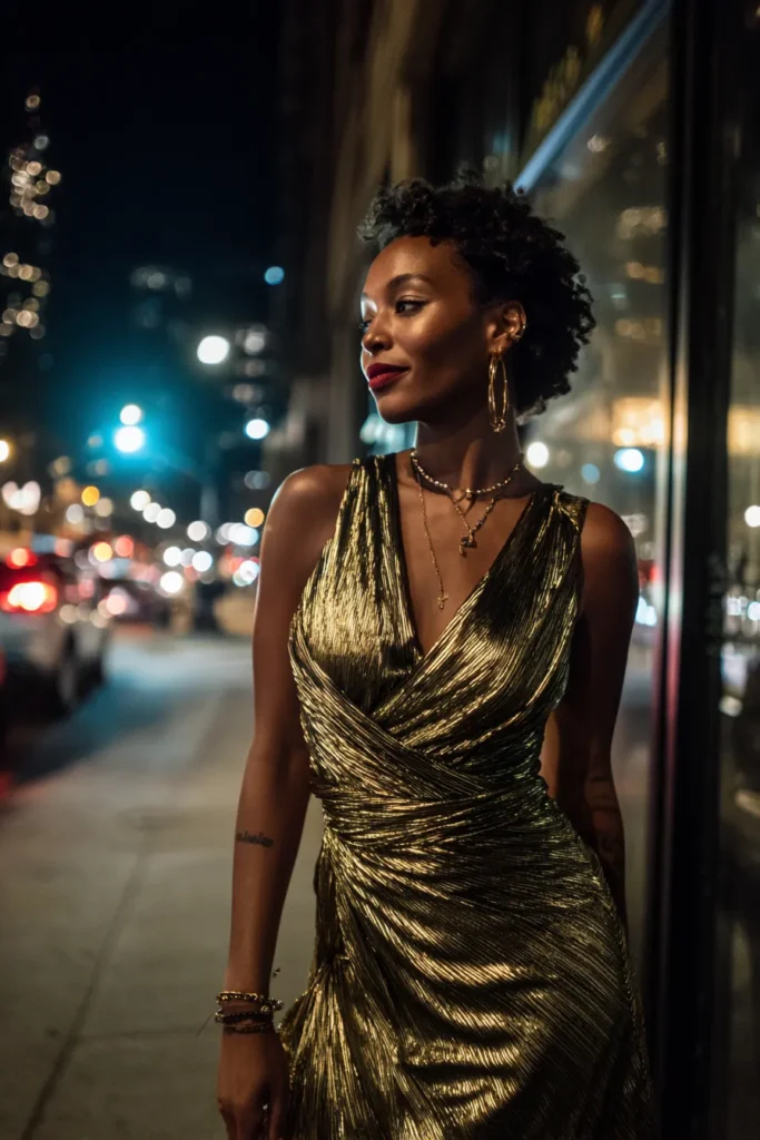 This look centers around a gold metallic dress with a softly wrapped shape that highlights the waist and adds texture through gentle ruching. The sheen of the fabric reflects the city lights beautifully and gives the outfit a luxe nightlife feel. It feels bold, warm, and perfectly suited for evening streets.