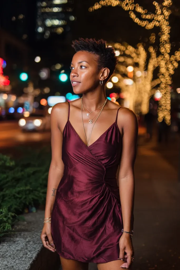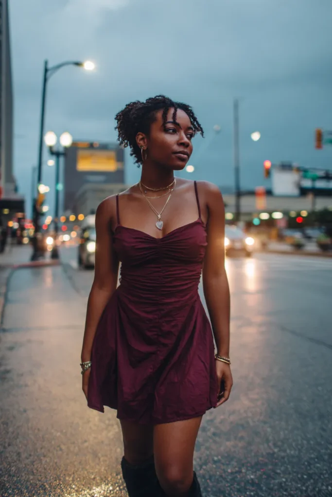 This look centers around a burgundy mini dress with delicate straps and gentle ruching that shapes the body beautifully. The rich color pops under nighttime lights and the shorter length keeps it playful and flirty. It feels romantic but still very grown and polished.