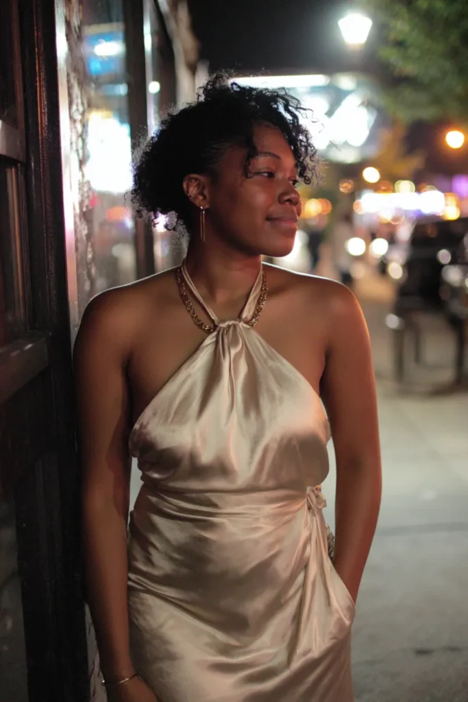 This look features a deep emerald satin dress with a halter neckline and soft ruching that hugs the body beautifully. The fabric has that glossy nighttime sheen that catches street lights just right, and the length keeps it feeling elegant instead of flashy. Paired with simple heels and minimal jewelry, the whole vibe feels confident and grown with a little bit of drama.