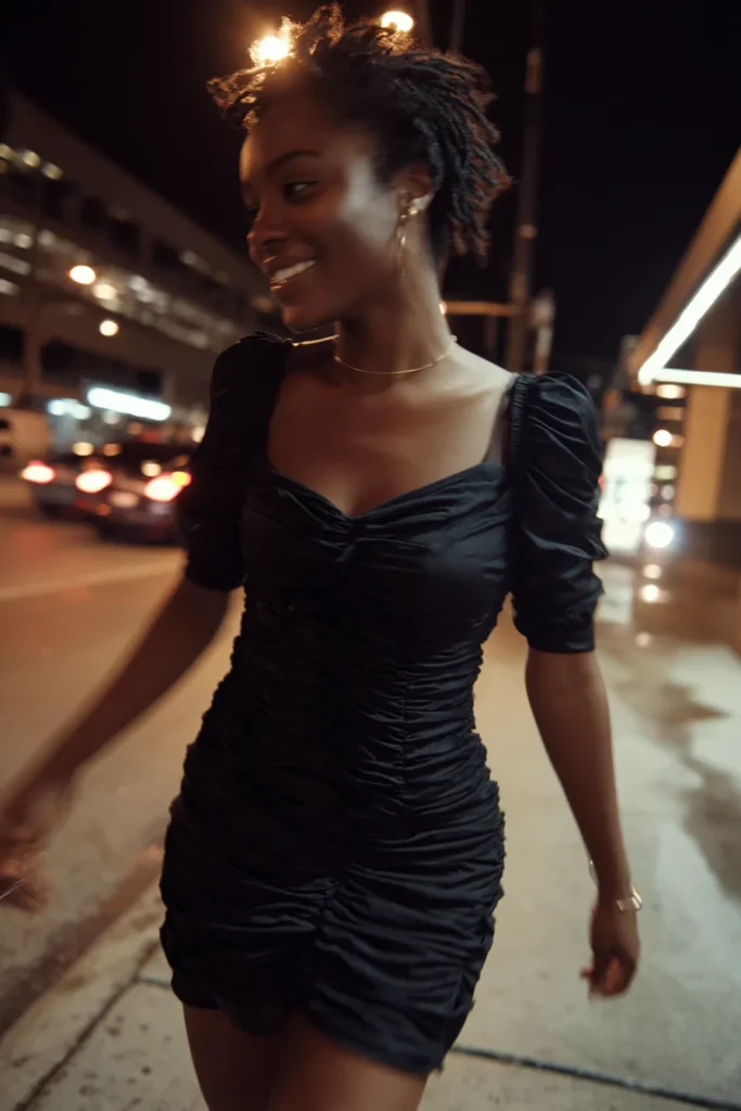 I always say you can never go wrong with a black mini and this one proves it. The ruching makes it flattering and forgiving and it feels easy to wear all night. It is a go to look when I want to feel cool and confident without overthinking it.