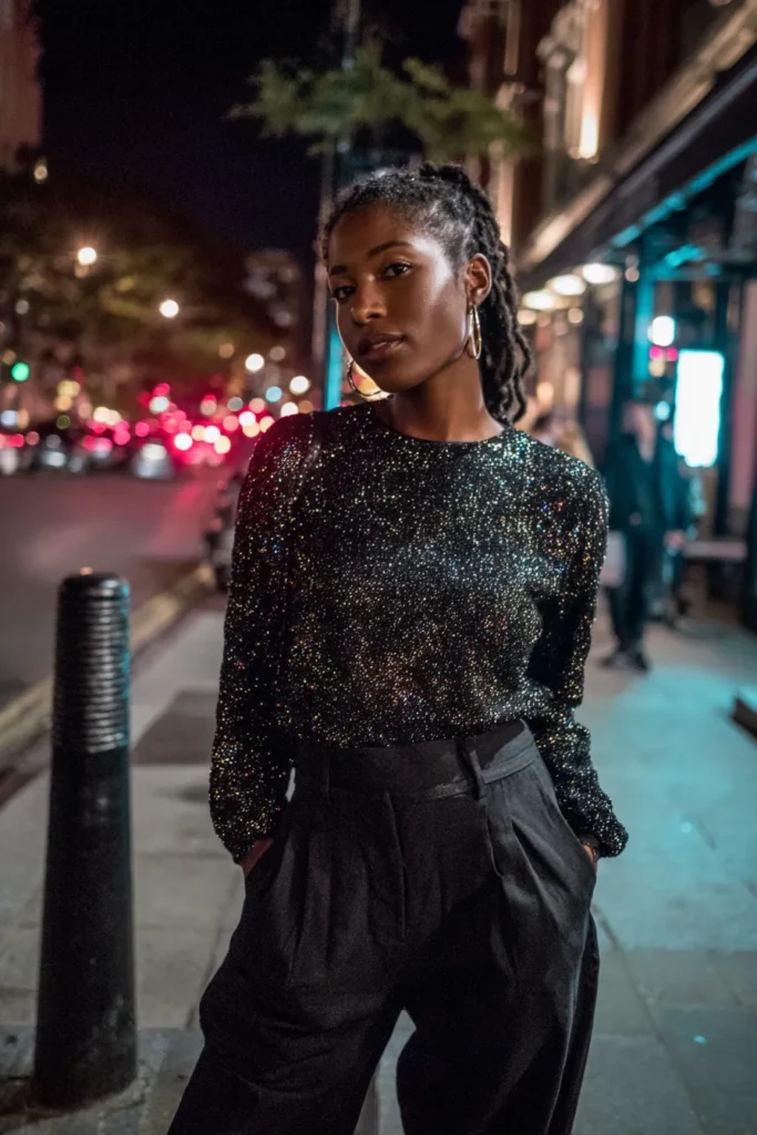 This outfit pairs a textured black long sleeve top with relaxed high waisted trousers for a cool nightlife look. The subtle shimmer in the fabric adds interest while the loose fit keeps it effortless. It feels modern and slightly edgy without being too much.