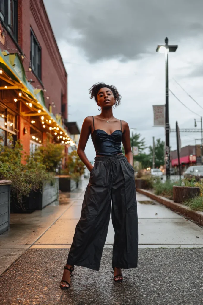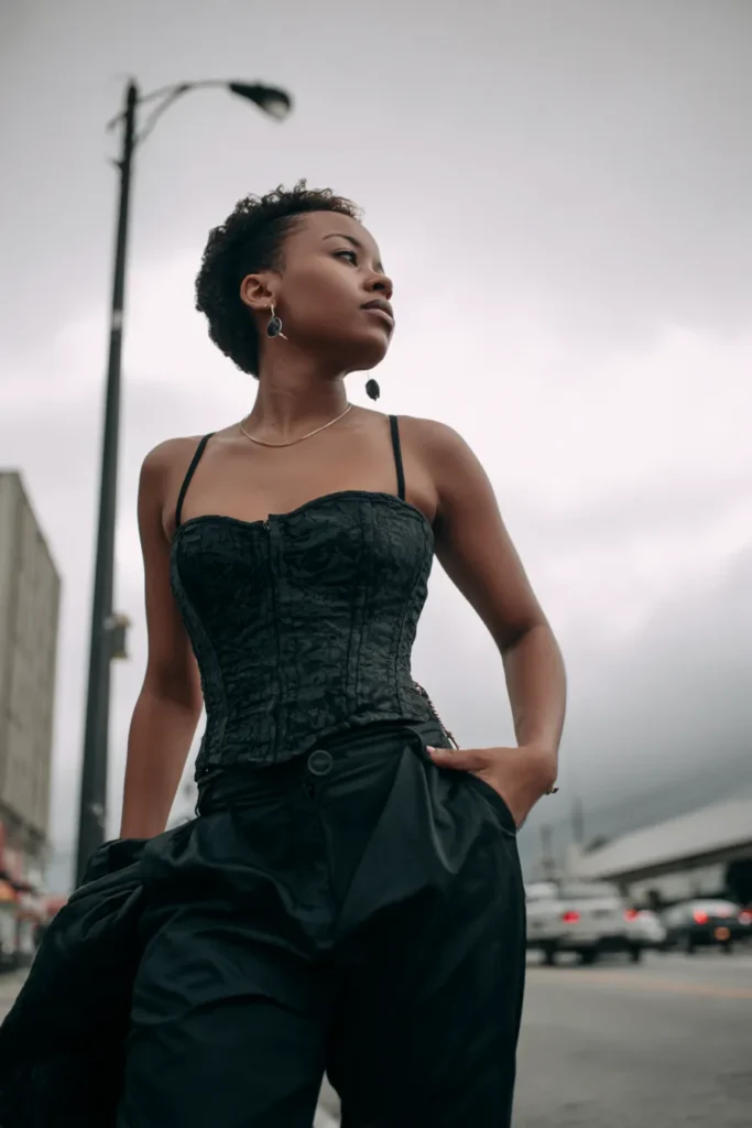 This look centers around a structured black corset top styled with relaxed high waisted trousers for a modern nightlife feel. The corset defines the shape while the looser pants balance it out and keep things comfortable. It feels intentional, cool, and very city chic.