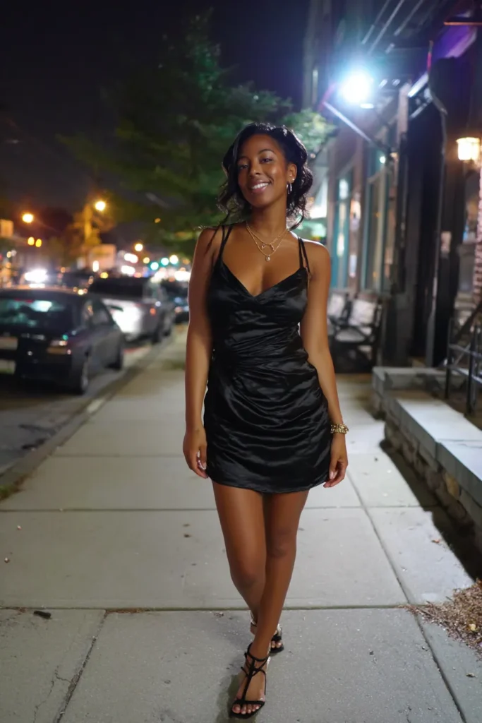 This look features a sleek black satin mini dress with soft ruching that hugs the body in the prettiest way. The thin straps and subtle sheen give it that after dark glow while still feeling relaxed and wearable. Paired with simple heels and minimal accessories, the whole outfit feels confident, unfussy, and very city at night chic.