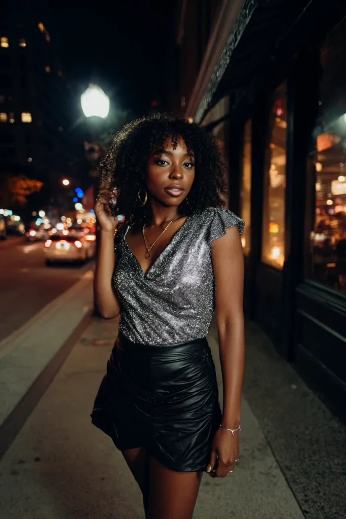 This look combines a shimmery silver top with a black leather mini skirt for a fun after dark contrast. The sparkle catches the light beautifully while the skirt grounds the look and keeps it edgy. It feels playful, confident, and made for city nights.