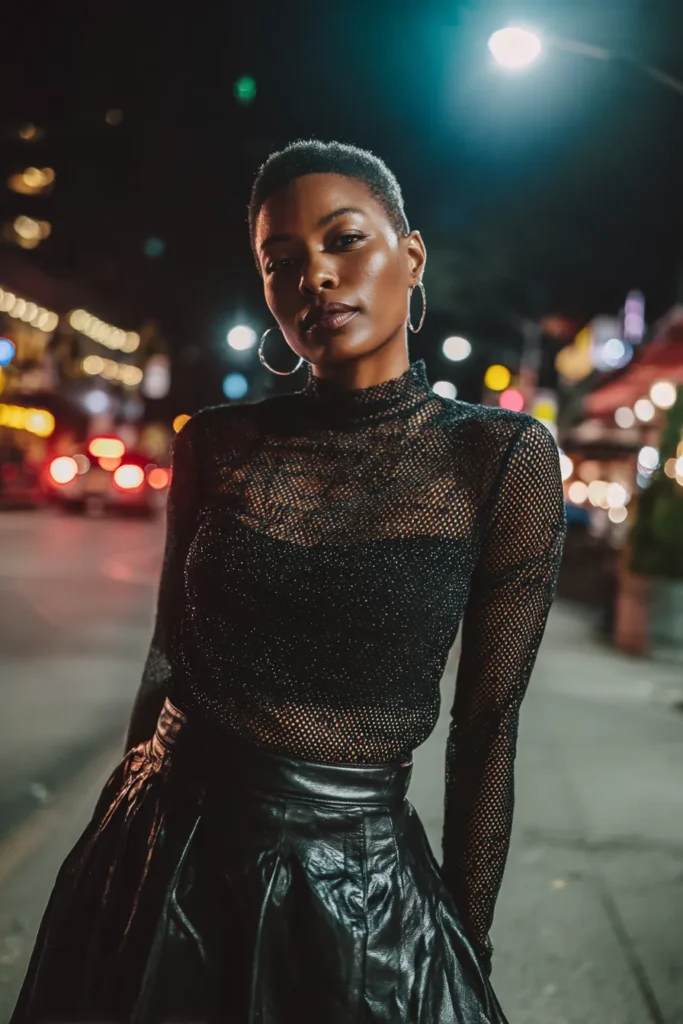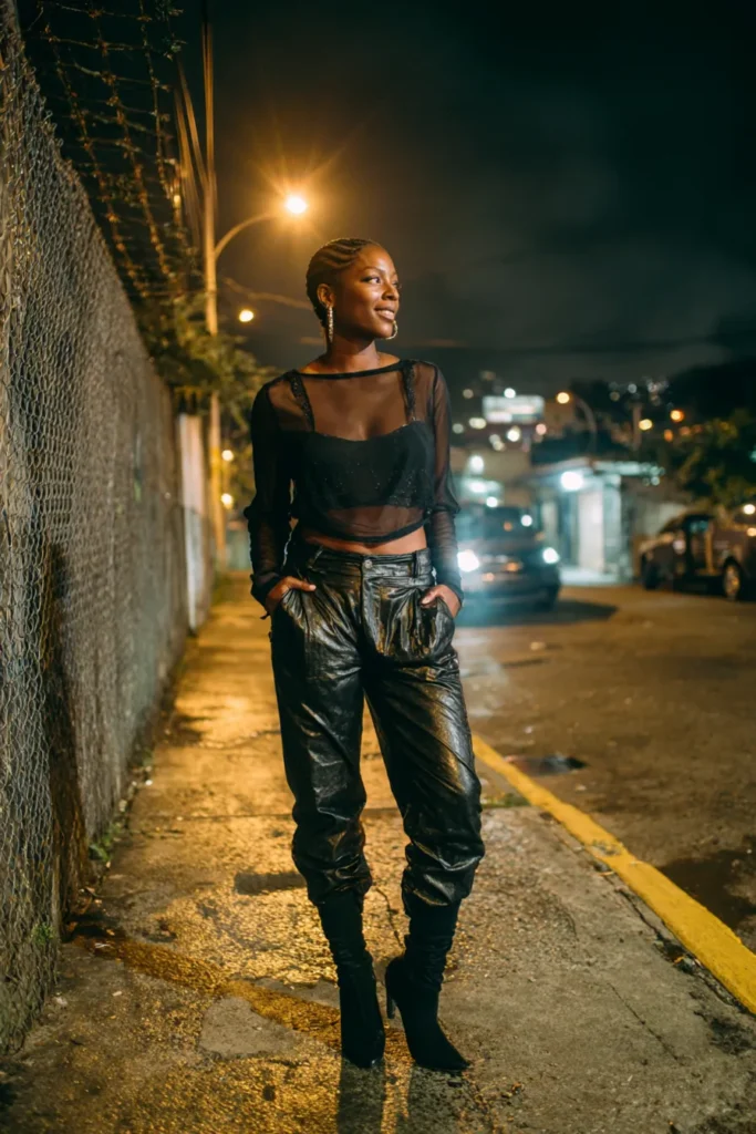 This outfit features sleek black leather pants paired with a sheer fitted top that shows just enough skin while still feeling refined. The mix of glossy leather and soft transparency creates a bold contrast that feels very after dark. The silhouette is confident and strong with a street style vibe that works perfectly under city lights.