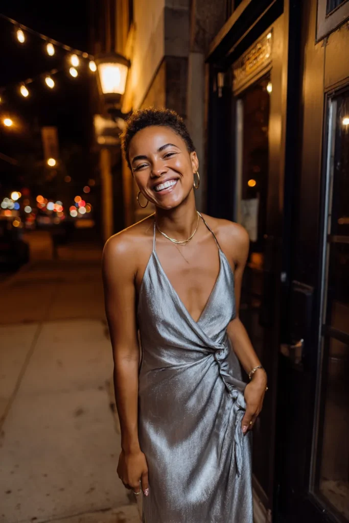 Here we have a silver slip dress with a fluid drape and a subtle metallic glow that looks stunning after dark. The thin straps and relaxed fit give it an easy elegance while the fabric naturally reflects nearby lights. It feels modern, feminine, and perfect for a late dinner or cocktails.