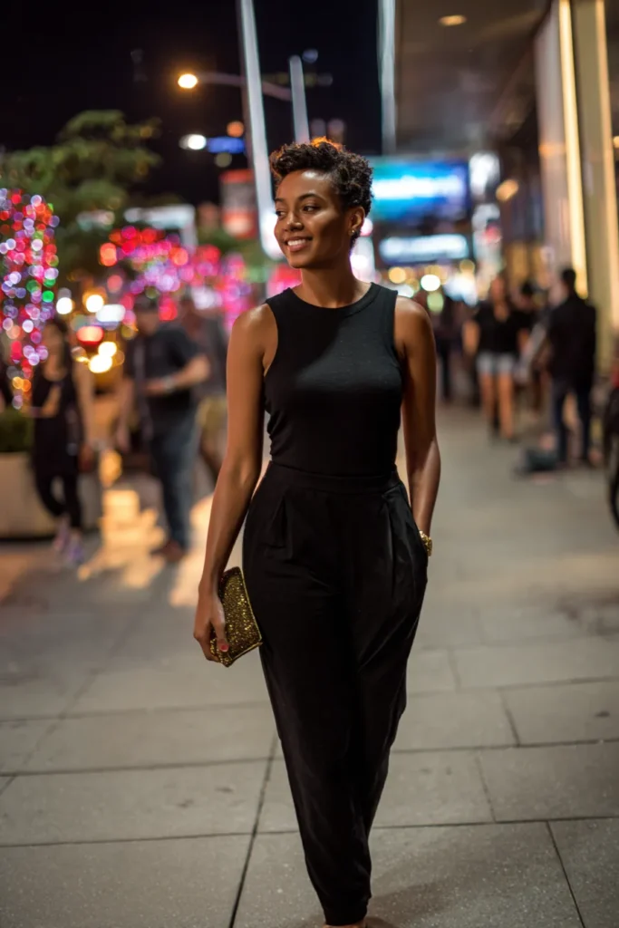 This outfit features a sleeveless black jumpsuit with a tailored fit that skims the body in all the right places. The clean neckline and full length silhouette give it a polished vibe while still feeling relaxed enough for a nightlife setting. It is understated, powerful, and incredibly versatile.