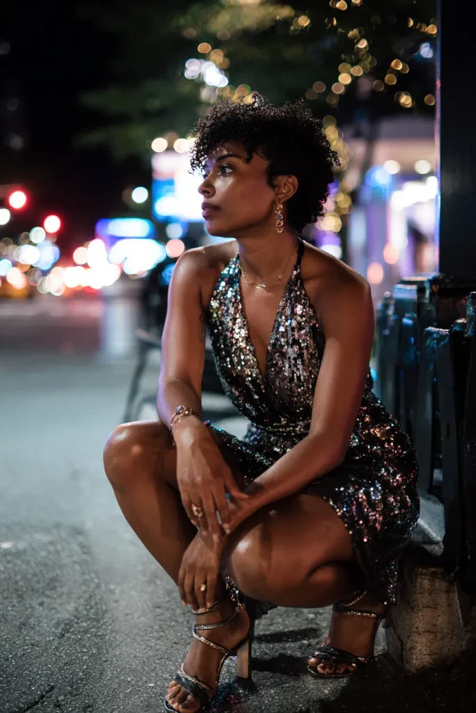 This outfit features a sparkly mini dress with a fitted silhouette that shines under city lights. The sleeveless cut keeps it playful while the shimmer brings instant nightlife energy. Styled with heels and a relaxed pose, it feels fun, flirty, and made for late nights out.