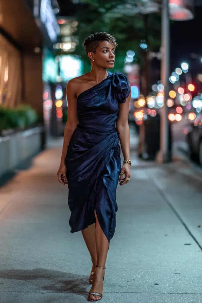 This outfit features a deep navy satin dress with a soft draped neckline and a fluid silhouette that moves beautifully while walking. The fabric catches the city lights in a subtle way and the midi length keeps it elegant and refined. Styled with simple heels, the whole look feels calm, confident, and effortlessly glamorous for a night out.