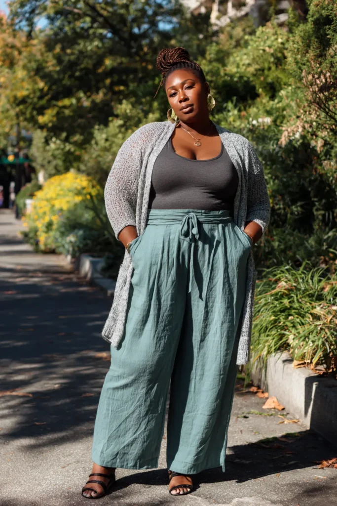 This outfit mixes a fitted grey tank with airy teal wide leg pants that create a soft flowing shape. The open knit cardigan adds texture and ties the look together while black sandals keep things grounded. It is relaxed with a touch of polish.
