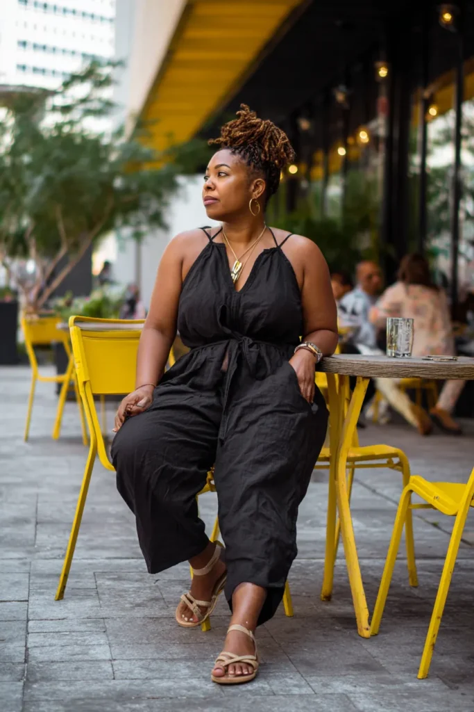 I love how this jumpsuit feels chic without any fuss. The relaxed fit gives me room to breathe and move while the halter detail adds a touch of polish. It is one of those outfits that works for dinner because it feels stylish in the most comfortable way.