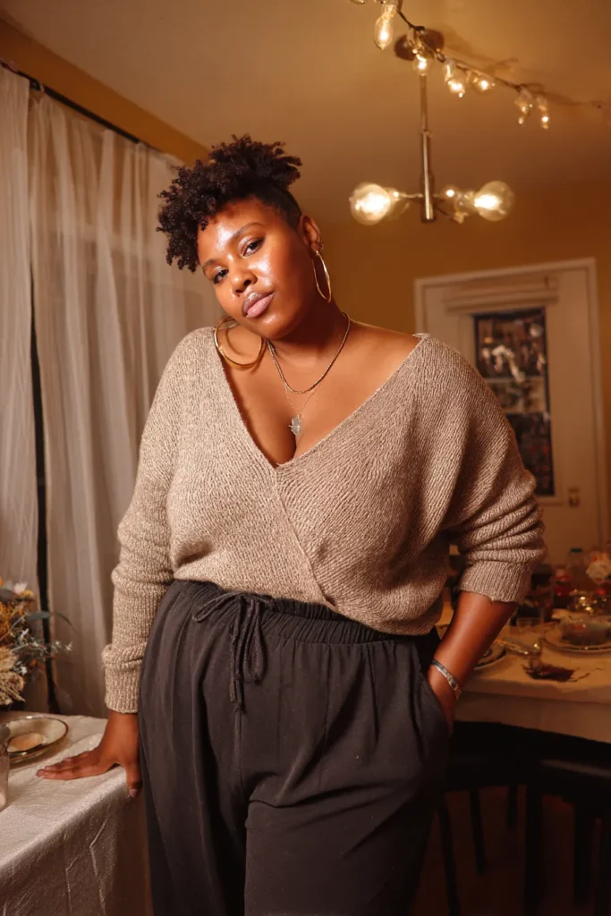 This look pairs a soft tan wrap style sweater with loose black drawstring pants that sit comfortably at the waist. The sweater has a cozy texture and a flattering neckline and the pants add just enough structure to keep the outfit from feeling too relaxed. The warm lighting and simple jewelry make the whole look feel inviting.