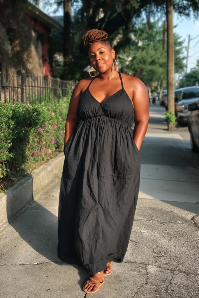 This black halter maxi dress has a breezy flow and a relaxed fit that skims the body without clinging. The neckline gives the look a gentle lift and the gathered waistline creates a naturally flattering shape. Paired with simple tan sandals it feels stylish in a comfortable understated way.