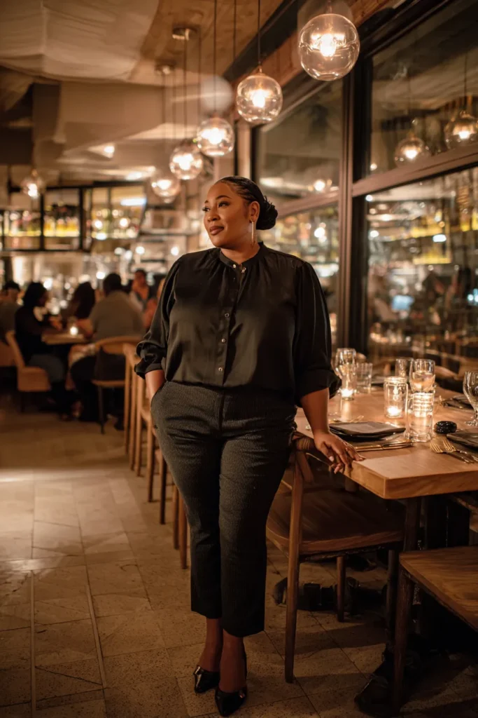 This outfit pairs a silky black blouse with tailored cropped trousers for an elegant evening vibe. The soft sheen of the top catches the warm lights inside the restaurant and the fitted shape of the pants keeps everything balanced. Black heels complete the look with a polished finish.