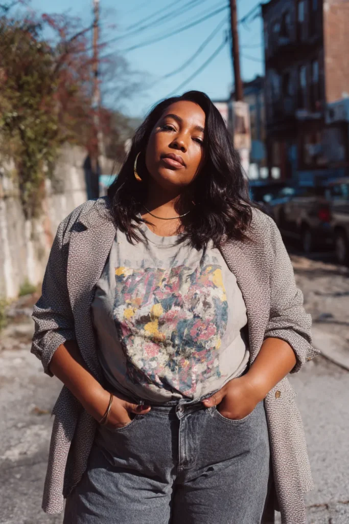 This outfit mixes a soft lived in graphic tee with a textured blazer and high waist jeans for a relaxed and stylish look. The tee adds personality and the blazer brings in a little structure. The denim gives the whole outfit a casual edge that feels perfect for an easy night out.