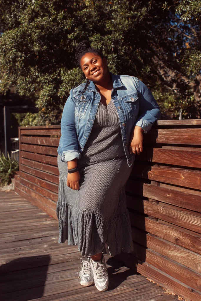 I love mixing a dress with a denim jacket because it always feels real and wearable. The combination is easy and cute and the sneakers make it perfect for a casual dinner where I want to feel relaxed but still put together.