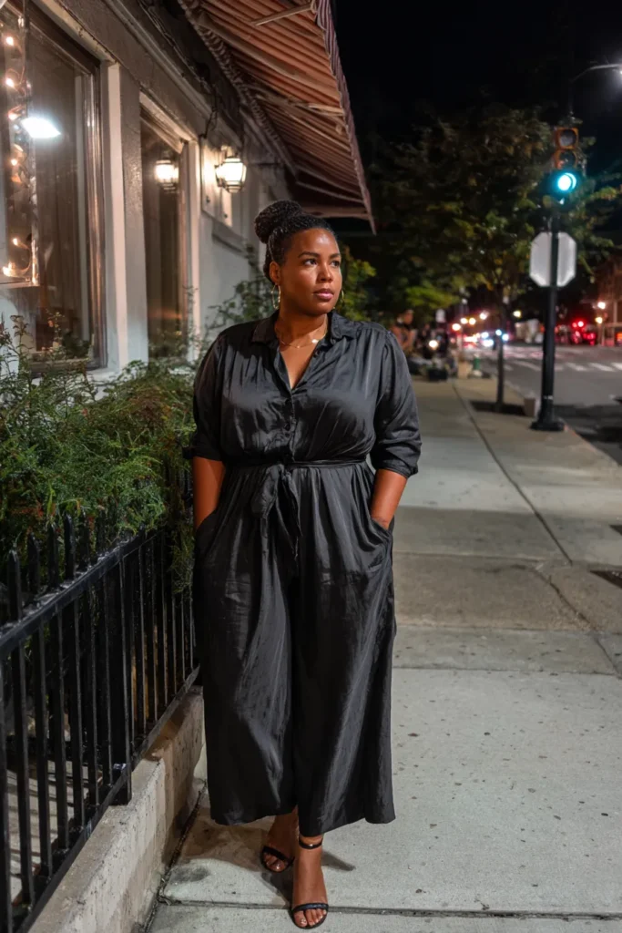This black jumpsuit has a smooth satin finish that gives it a soft shine in the evening light. The tie waist adds structure and the wide leg shape keeps the outfit comfortable. Strappy heels make it feel dressy without being too formal.