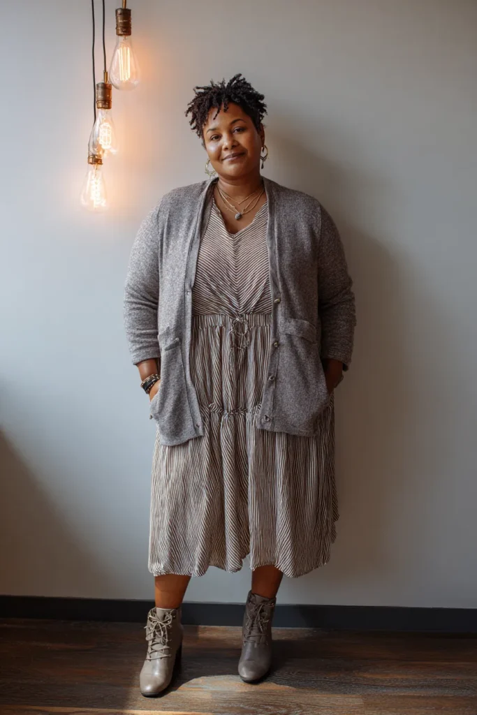 This outfit layers a striped dress with a soft grey cardigan that adds warmth and texture. The dress has a relaxed shape and the cardigan brings in a cozy everyday feel. Neutral ankle boots finish the outfit with a grounded touch.