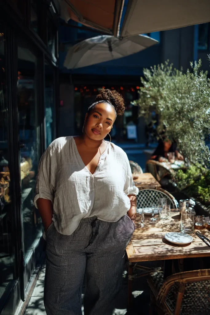 I love this outfit because it feels effortless without losing its charm. The linen top brings a breezy ease and the striped pants make the look feel put together in a simple way. It is an ideal choice for a relaxed meal out when comfort and style meet in the sweetest balance.