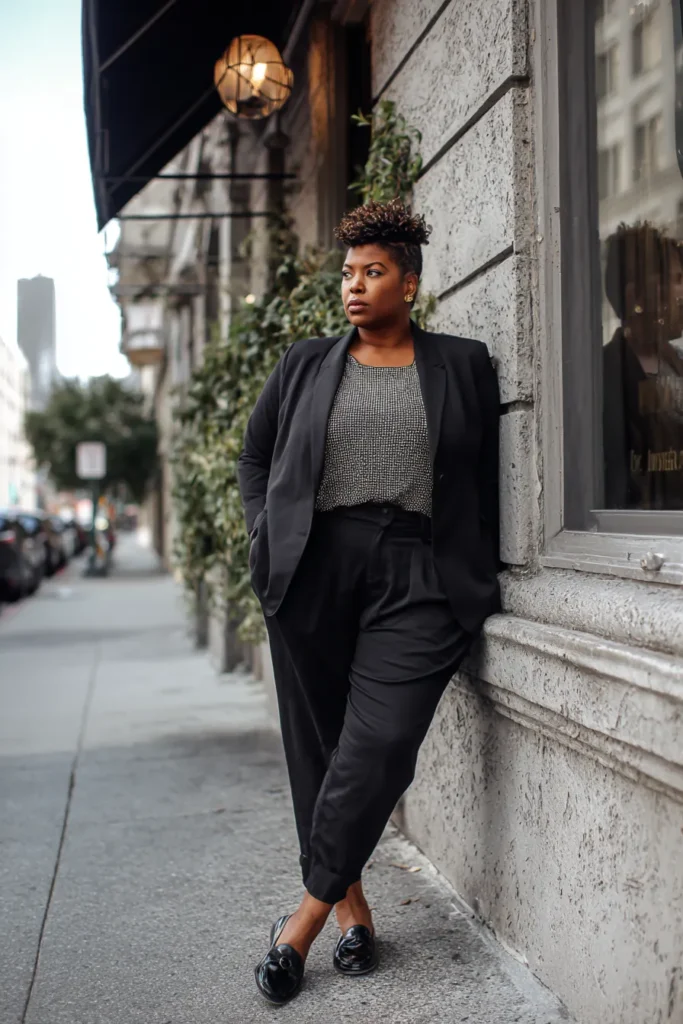 This outfit pairs a structured black blazer with matching trousers and a textured top that adds a hint of sparkle. The tailored fit creates clean lines while the loafers keep everything grounded and easy. It is sleek simple and perfect for a polished dinner look.