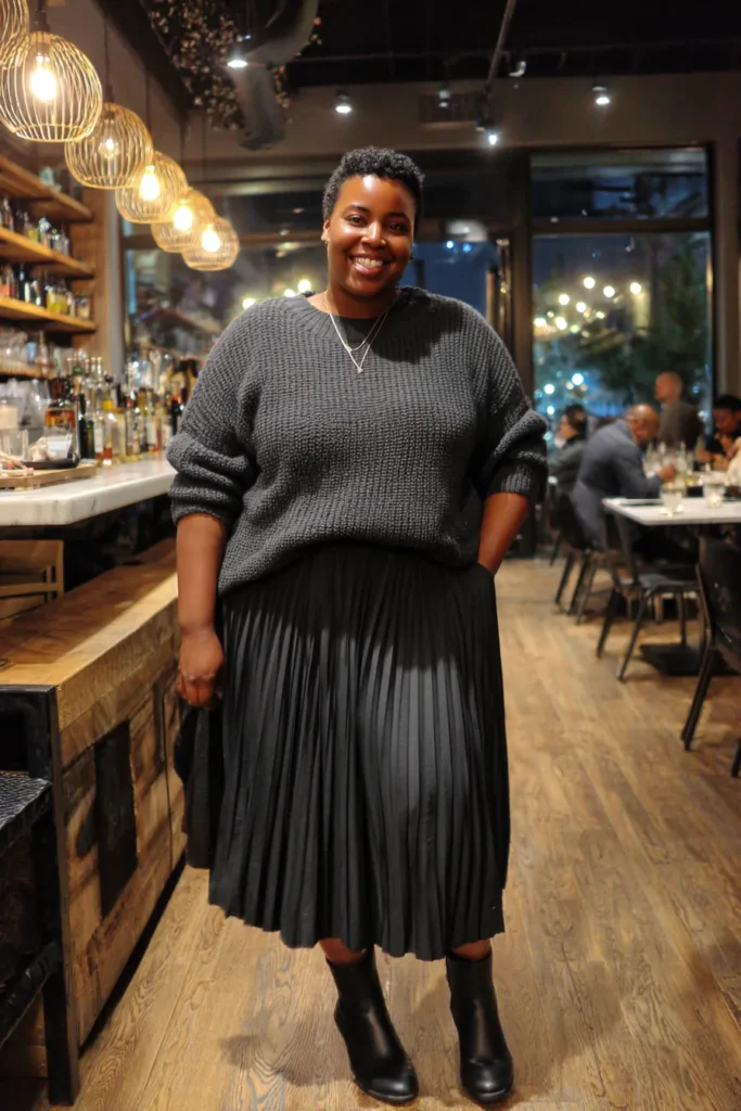 A chunky knit sweater meets a soft flowing pleated skirt in this cozy dinner look. The grey tones blend beautifully and the black ankle boots add a little edge without taking away from the softness. It feels warm relaxed and stylish all at once.