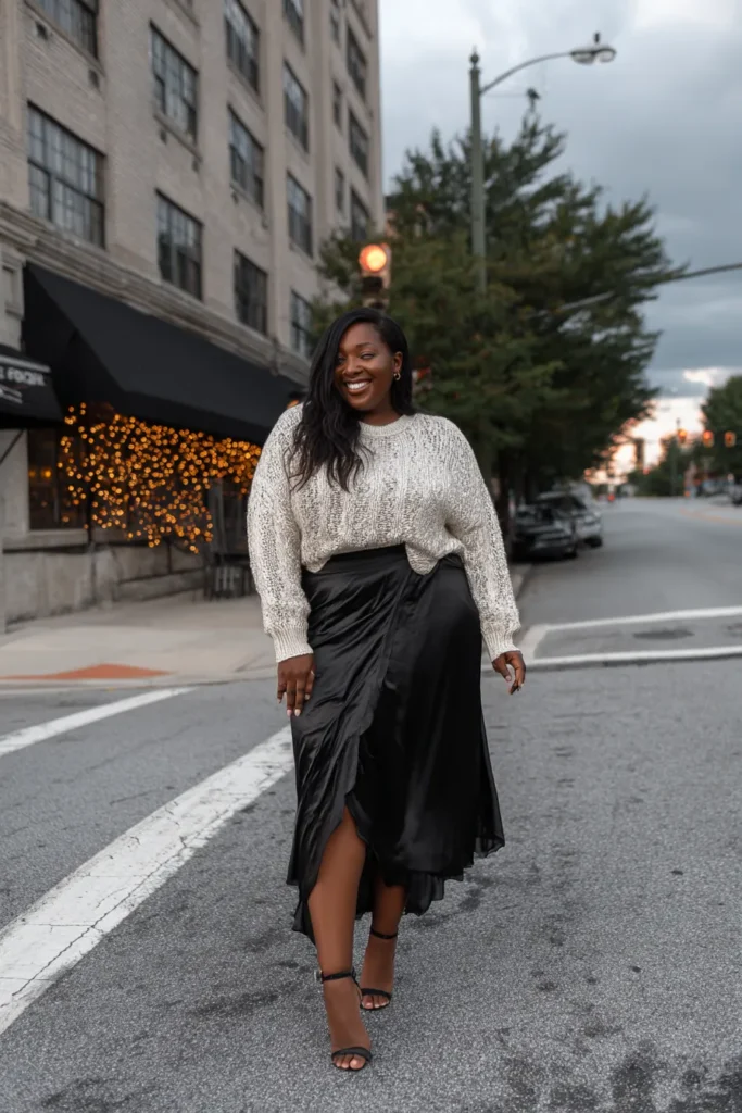 This look combines a soft cream knit sweater with a silky black wrap skirt that drapes beautifully. The textures contrast in the best way and the strappy heels bring in a little evening flair. It feels polished yet relaxed.