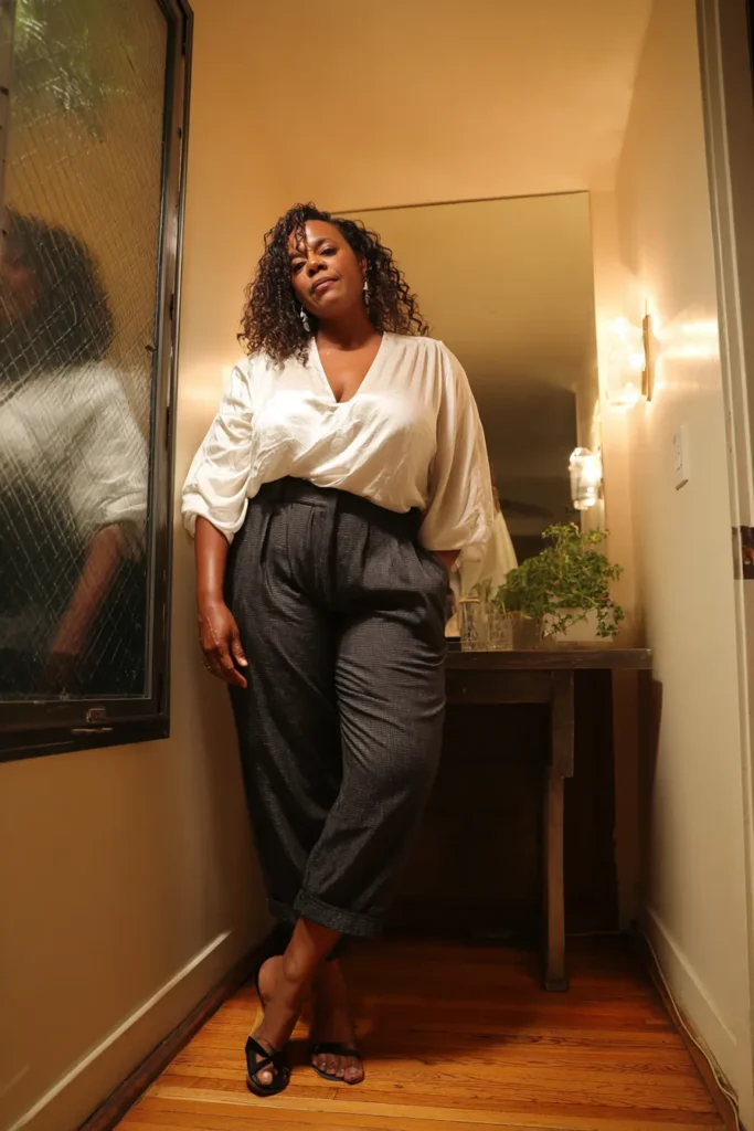 This look pairs a flowy white surplice top with charcoal high waist trousers for an easy refined vibe. The top drapes softly and the trousers bring structure without feeling stiff. Simple black sandals finish the outfit with a clean touch.