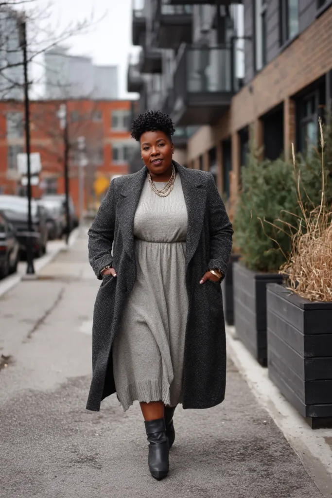 A soft grey sweater dress sits under a charcoal textured coat creating a warm layered look. Black ankle boots keep it sharp and the subtle details in the knit make the outfit feel quietly stylish. It is simple but full of personality.